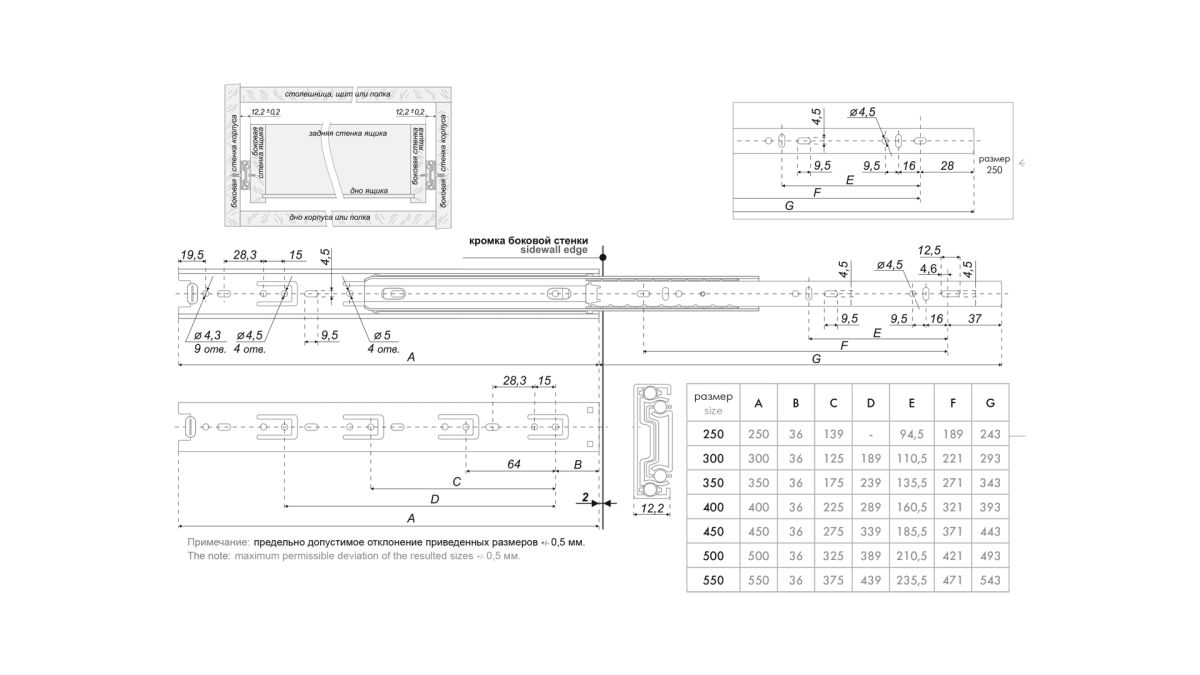 DB3501 — шариковые направляющие полного выдвижения без амортизации, выполненные по европейскому стандарту. Обладают современными характеристиками и обеспечивают стабильное движение мебельных ящиков и плавный, равномерный ход. Модель надежна и долговечна – она обладает оптимальной грузоподъемностью до 20 кг (зависит от монтажной длины) и гарантирует бесперебойную работу механизма на протяжении 30 000 циклов открывания/закрывания.
