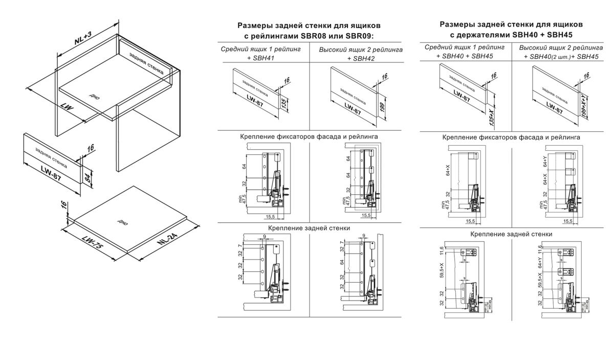 Для сборки выдвижного мебельного ящика с помощью направляющих DB8181 необходимо самостоятельно изготовить фасад, заднюю стенку и дно ящика, изготовленные с учетом собственных пожеланий и потребностей, а также выбрать боковины, держатели задней стенки и держатели рейлинга и сами рейлинги (в зависимости от требуемой высоты проёма готового выдвижного мебельного ящика). Схема раскроя дна выдвижного мебельного ящика соответствует уже зарекомендовавшей себя популярной системе B-BOX SB04 и европейским аналогам.