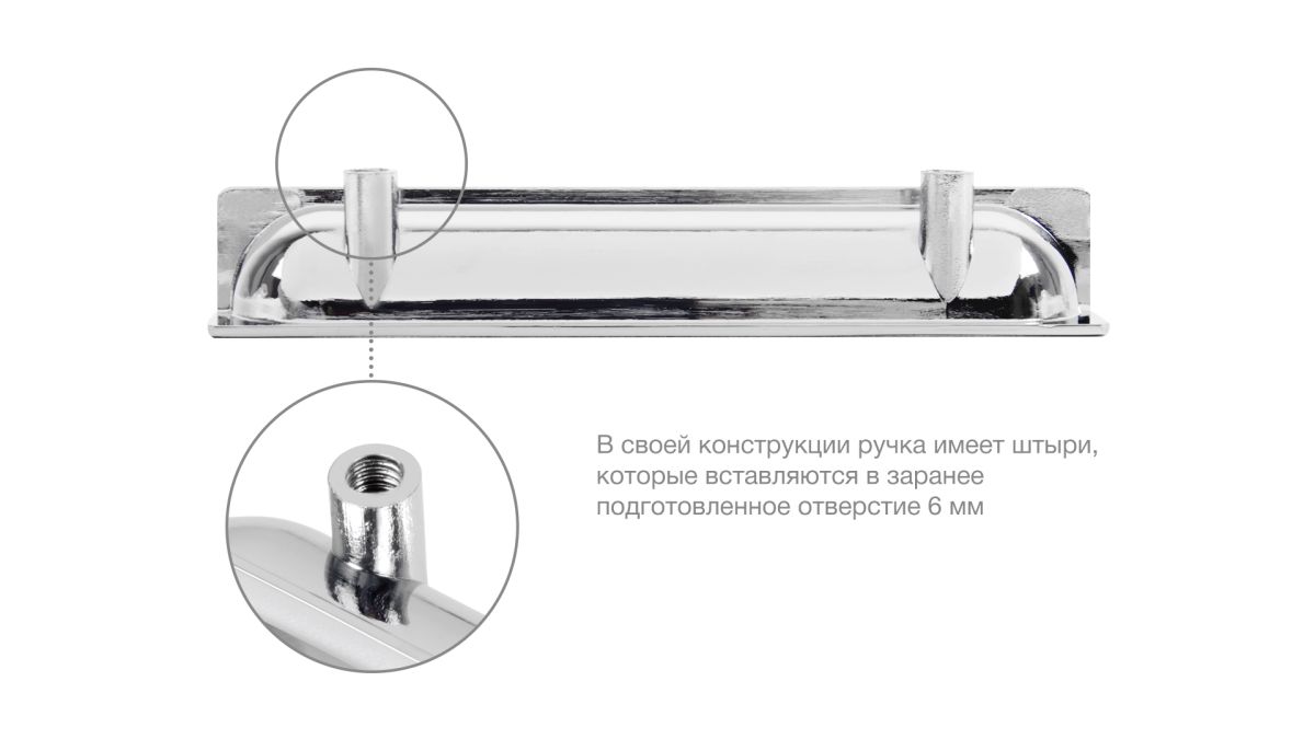 Конструкция модели имеет специальные штыри, которые вставляются в заранее подготовленное отверстие в торце фасаде на его внутренней стороне с размером 6 мм. Для надёжной фиксации ручки с фасадом применяется клей (приобретается отдельно в специализированных магазинах в зависимости от материала фасада).