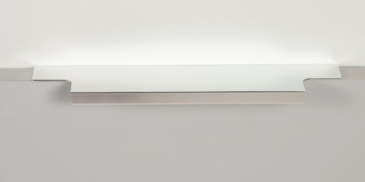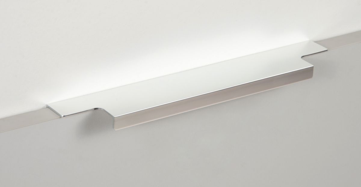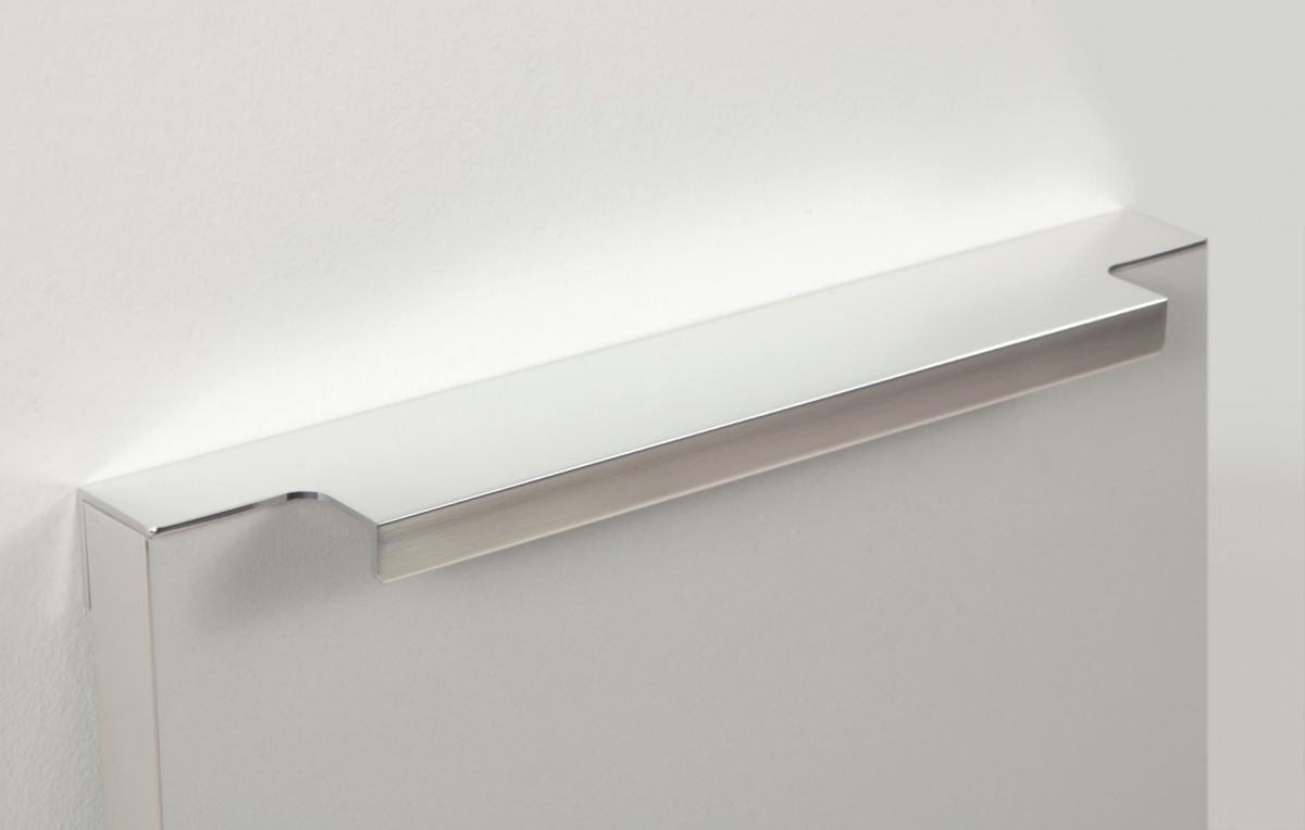 Ручка имеет богатую палитру цветовых решений и разнообразие длин. В зависимости от длины, модель допускает размещение двумя способами — «в размер» фасада и по центру широких фасадов (как большой «язычок»).