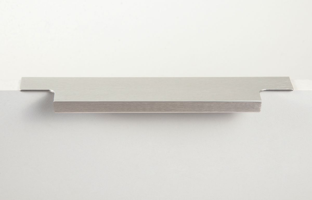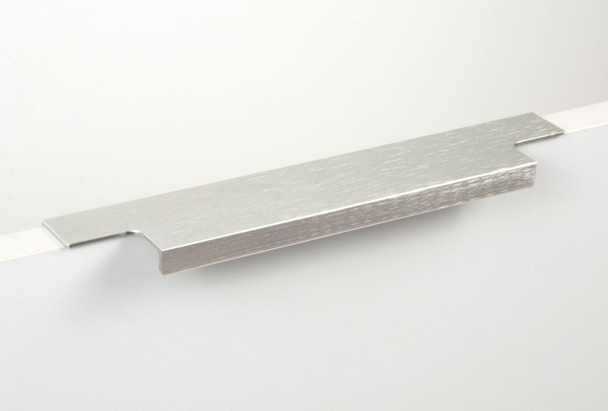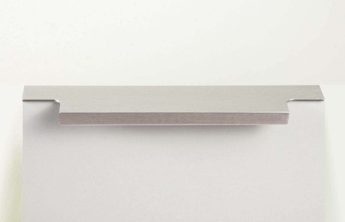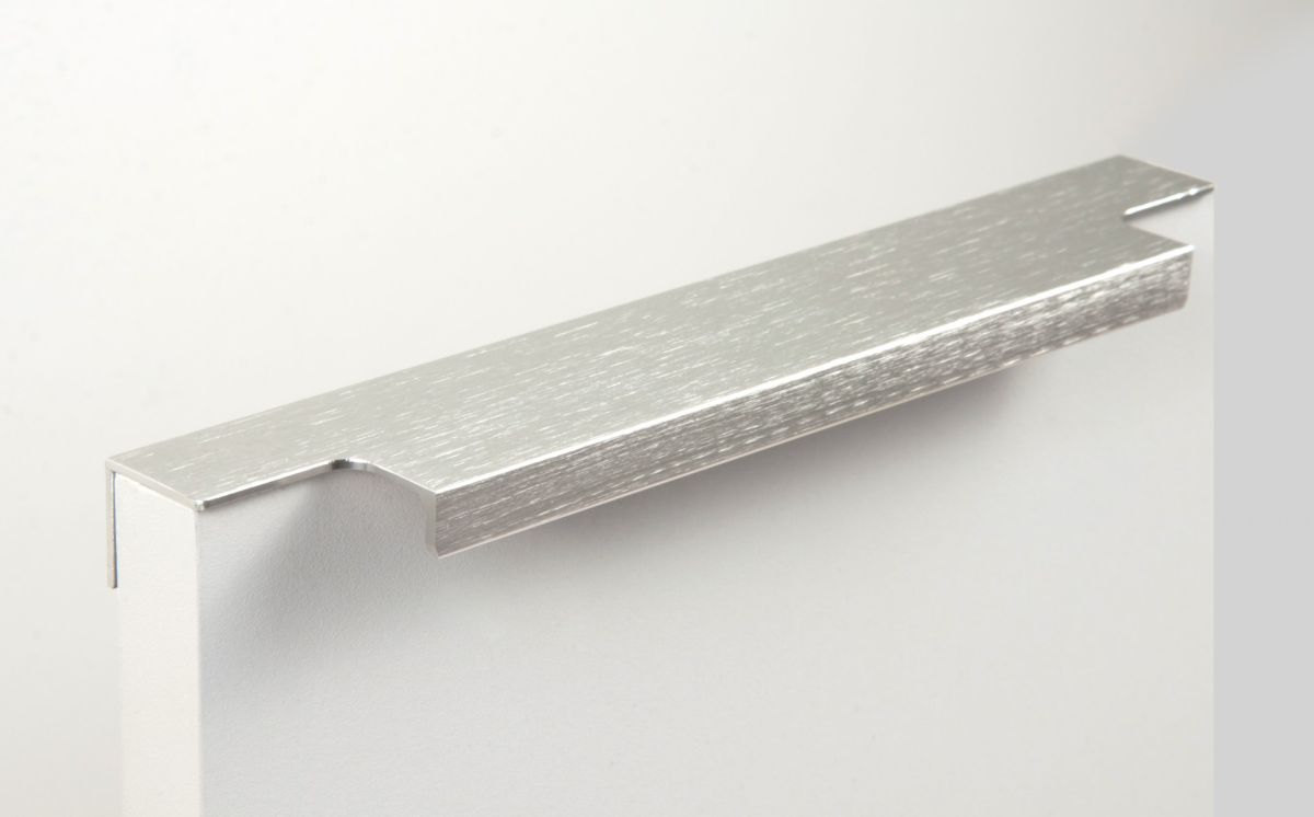 Ручка имеет богатую палитру цветовых решений и разнообразие длин. В зависимости от длины, модель допускает размещение двумя способами — «в размер» фасада и по центру широких фасадов (как большой «язычок»).