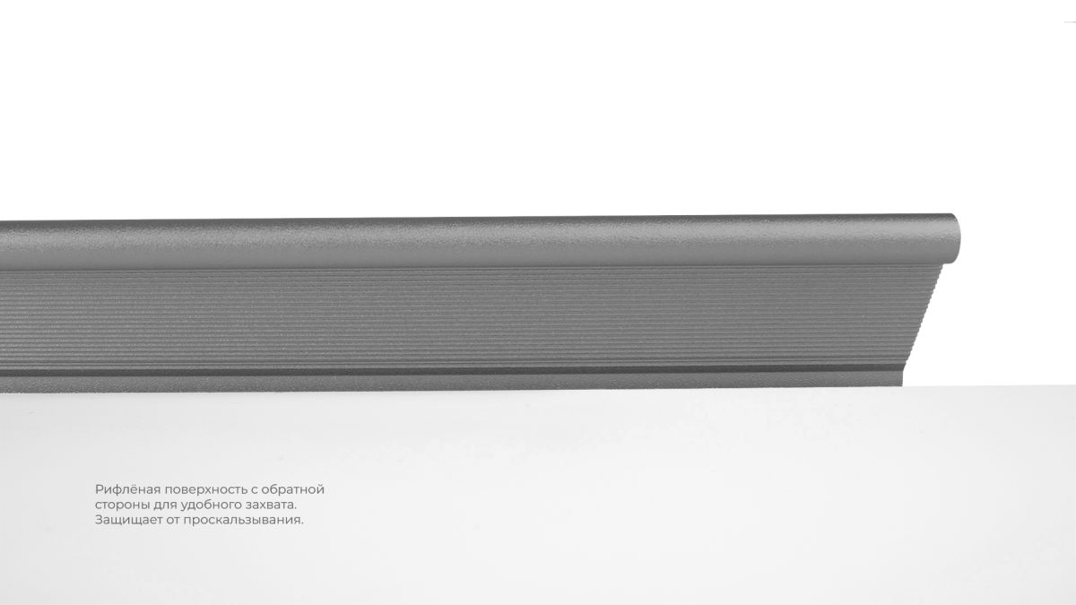 METRICA RT112 — торцевая ручка из алюминия, с геометричным выступом и рифлением в зоне захвата для эргономичного использования. Устанавливается наложением, подходит для фасадов толщиной от 16 мм до 20 мм.