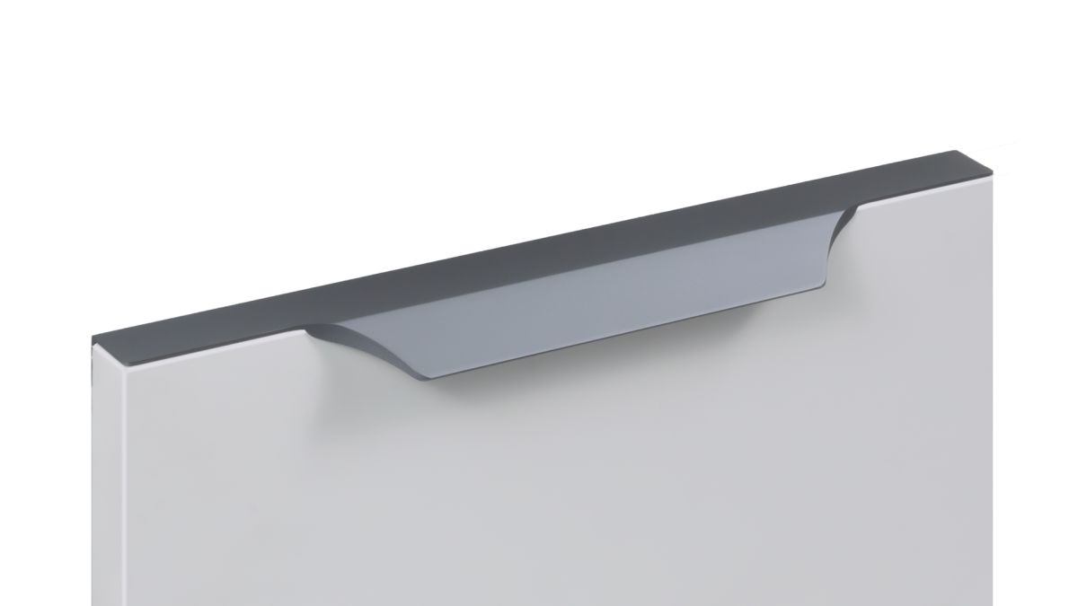 WING RT114 — торцевая ручка с изгибом из алюминия, устанавливается наложением на фасады толщиной 18,8 мм (в цветах BL,GR,SC,SG) и 18,5 мм (в цвете W).