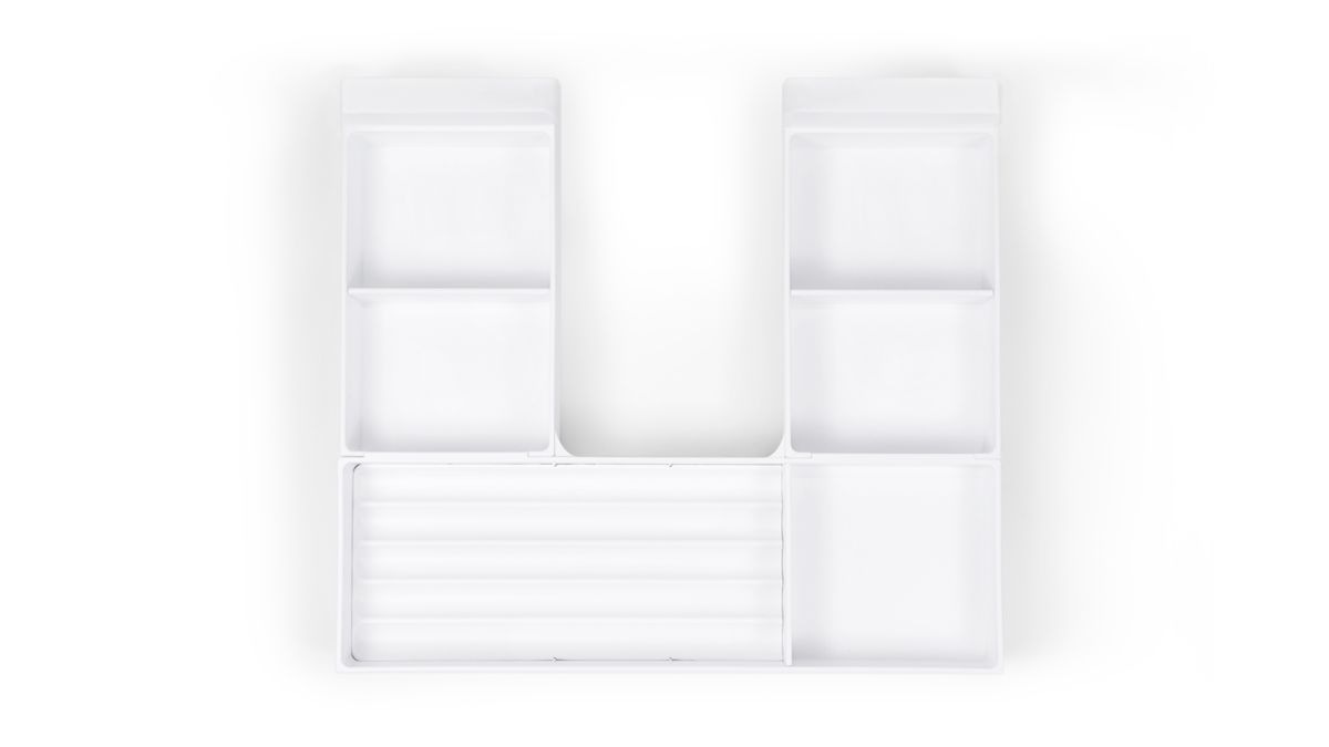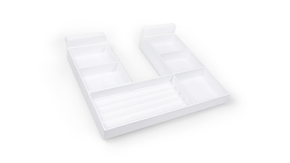 В комплект входит: фронтальный поддон, два боковых поддона, 3 съемных делителя, 1 вставка во фронтальную часть для узких длинных предметов.