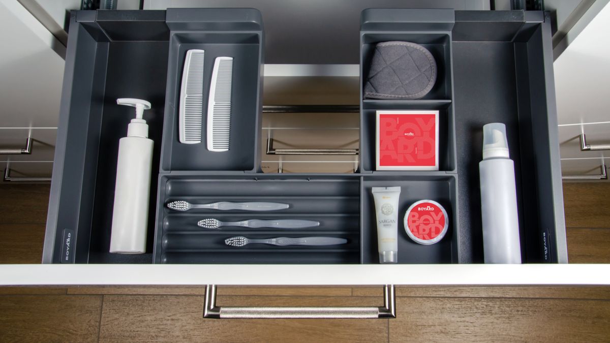В комплекте также идут специальные делители, которые позволяют организовать пространство внутри поддонов так, как удобно пользователю. Для среднего отсека в комплекте предусмотрена рифлёная вставка для зубных щёток.