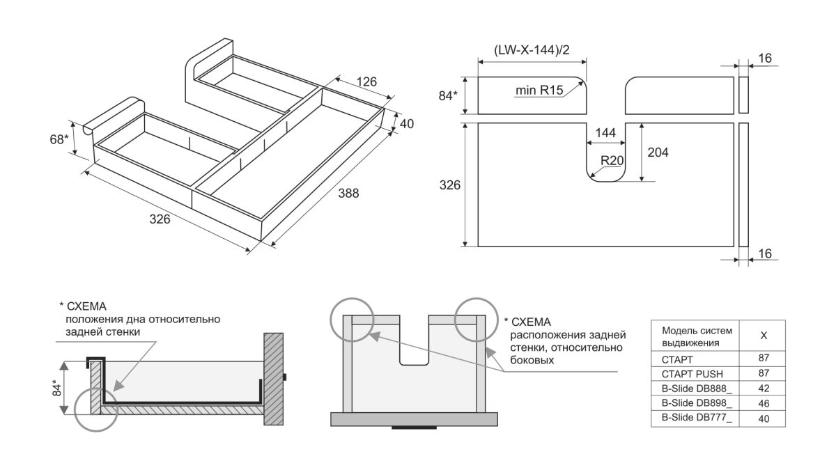 Подходит для систем выдвижения СТАРТ с прямыми и традиционными боковинами глубиной 350 мм и шириной баз от 600 мм. Конструкция изделия также позволяет его использовать в мебели на любых других направляющих, например, из линейки B-SLIDE..