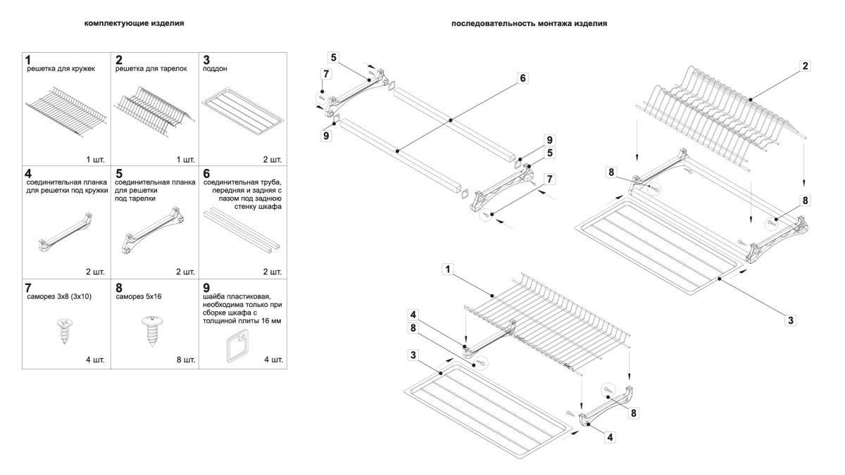 Комплект сушки включает 2 яруса для хранения посуды с надёжным гальваническим покрытием с эффектом хромирования, 2 съёмных поддона из качественного бесцветного пластика, 4 пластиковых серых держателя нижнего и верхнего уровней, переднюю и заднюю алюминиевые трубки, саморезы для монтажа сушки и крепления трубки.