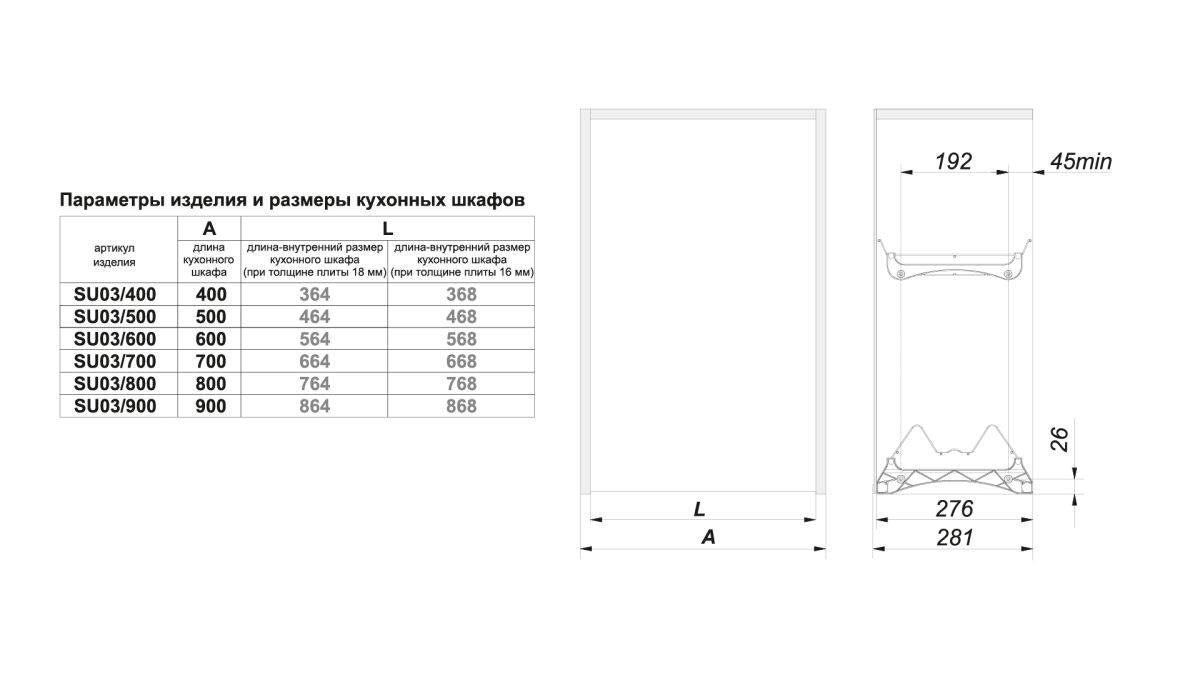 SU03 представлена в широком диапазоне длин: от 400 до 900 мм. Каждый ярус сушки рассчитан на грузоподъёмность 12 кг. Сушка может монтироваться в мебель с толщиной боковых стенок как 16 мм, так и 18 мм.