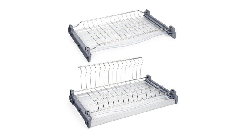 Нижний ярус сушки имеет L-образную форму для устойчивого размещения посуды, а поперечные прутки позволяют удерживать тарелки разного диаметра от 11 до 24 см.