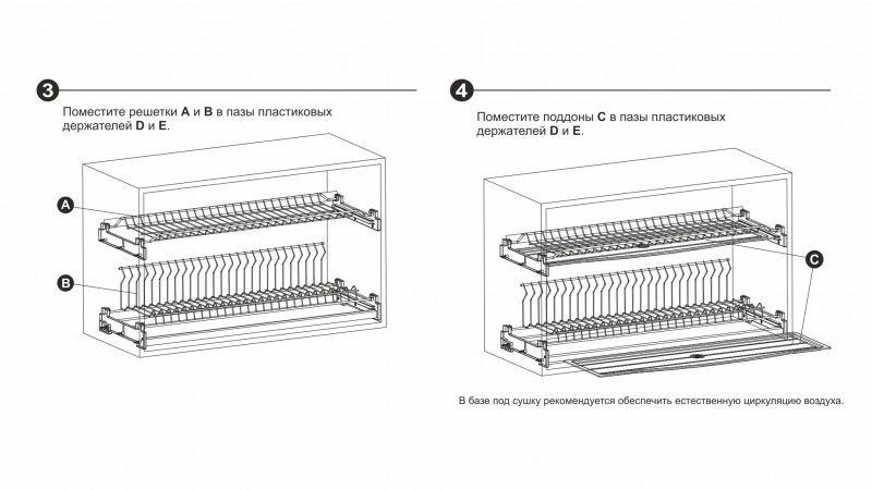 Сушка может быть полностью интегрирована с корпусом мебели. Пластиковые держатели нижнего яруса и алюминиевая трубка имеют специальный паз для установки задней стенки короба.