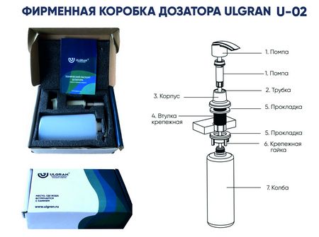 Дозаторы ULGRAN заполняются моющим средством только СВЕРХУ, не нужно откручивать колбу под кухонной мойкой. Вытащите помпу и залейте моющее средство через отверстие в корпусе.