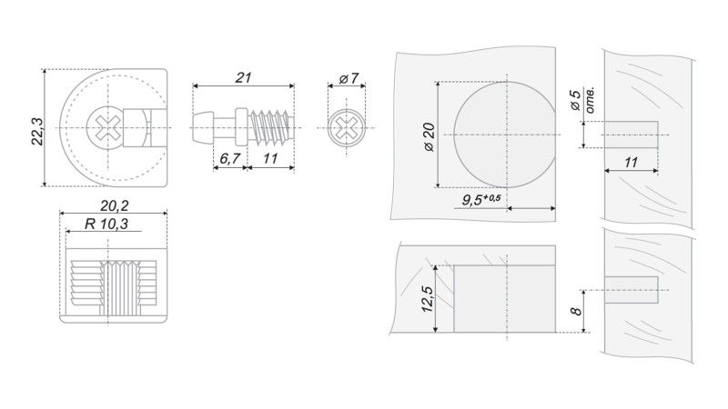 ST01/49 — эксцентриковая стяжка-полкодержатель в пластиковом корпусе. Стяжка состоит из эксцентрика диаметром 20 мм, высотой 12 мм и дюбеля с евро-резьбой. Стяжка предназначена для фиксации деталей мебели толщиной от 16 мм до 22 мм. Особенностью модели является упрощенная сборка: вместо двух отверстий в полке достаточно просверлить одно – для пластиковой основы. Кроме того, стяжка обладает более эстетичным внешним видом, нежели металлические аналоги. Эксцентриковая стяжка ST01/49/3 обеспечивает высокое качество сборки мебели, ее прочность и долговечность.