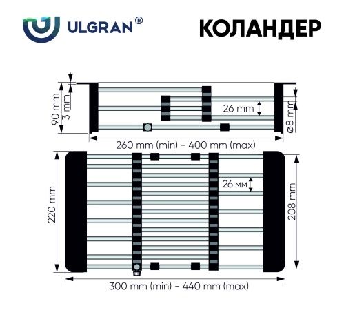 Универсальность коландера состоит в том, что в силу своих конструктивных особенностей он может использоваться от своих минимальных значений по длине от 260 мм до максимальных 440 мм. Соответственно, он подходит к абсолютному большинству моделей моек ULGRAN.